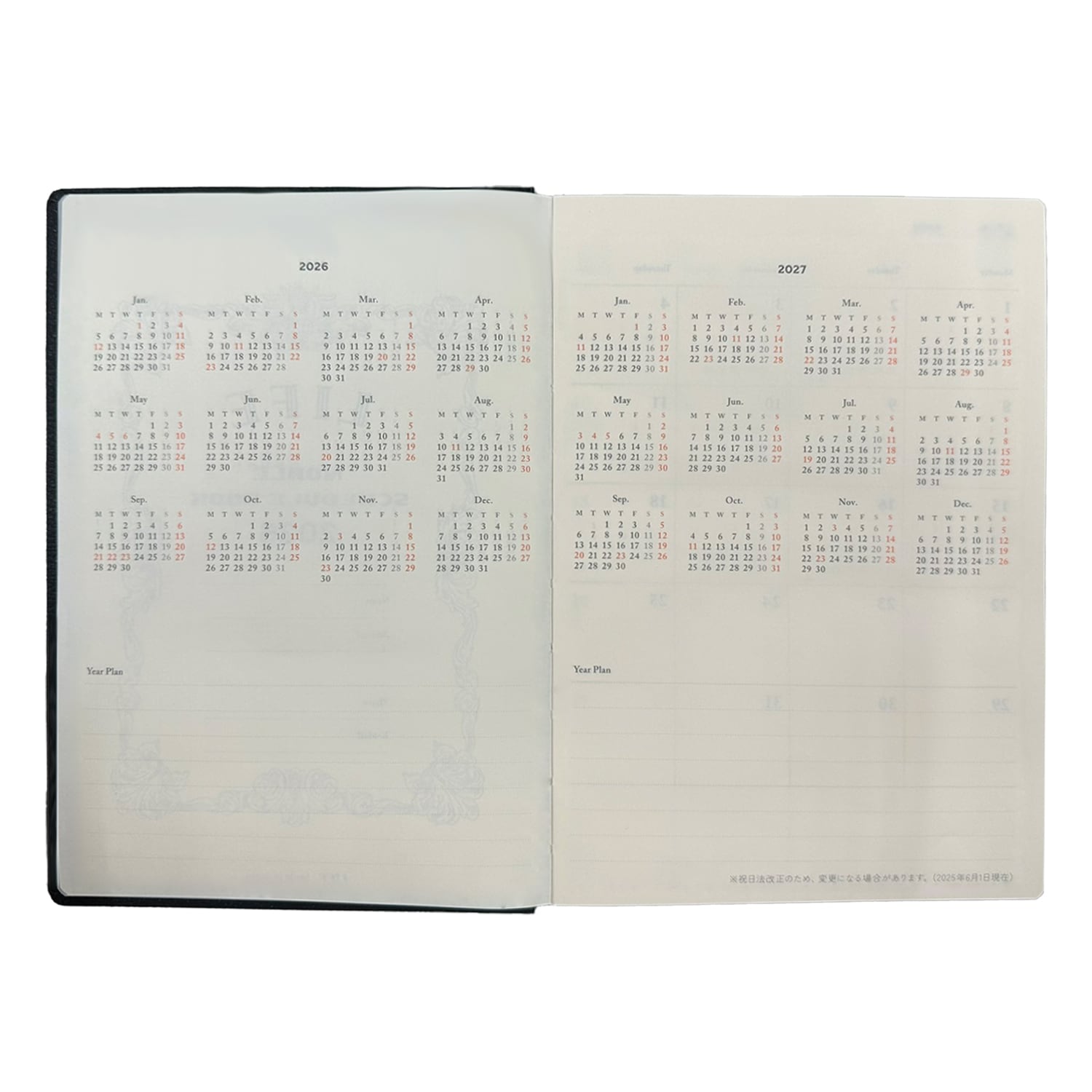 シンプルなブロックカレンダーに充実したノートページを加え、持ち運びもしやすいB6サイズです。